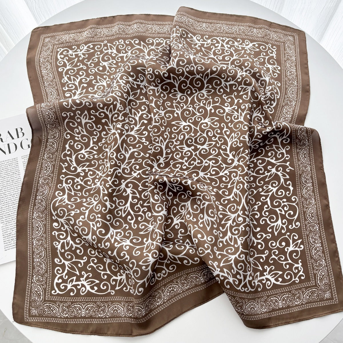 La Pañoleta Augusta es una celebración de la elegancia orgánica y el minimalismo refinado. Su diseño destaca por un intrincado patrón de enredaderas y follaje en blanco puro que contrasta armoniosamente sobre un fondo color café moka, creando una pieza versátil que evoca serenidad y un gusto impecable por lo natural.